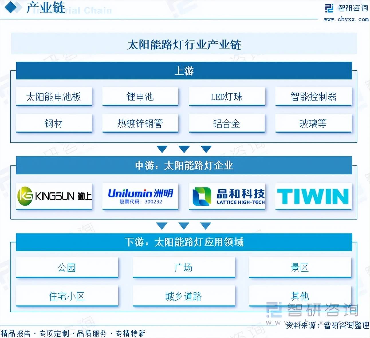 太阳能路灯产业链主要包括上游原材料供应、中游的制造和组装以及下游应用。上游原材料主要包括太阳能电池板、锂电池、LED灯珠、智能控制器、钢材、热镀锌钢管、铝合金、玻璃、塑料等。产业链中游为太阳能路灯的制造和组装环节。产业链下游为应用领域,包括公园、广场、景区、住宅小区、城乡道路等场所。