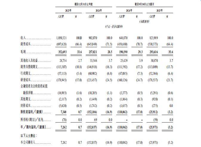 财务数据显示,华睿科技经历2024年市场阶段性调整后,2025年重返增长轨道。2023年、2024年公司分别实现收入10.50亿元、9.02亿元,2025年前三季度收入同比增长27.0%至8.24亿元;毛利率同步改善,由2024年前三季度的29.3%提升至2025年同期的35.6%,恢复至2023年水平以上。