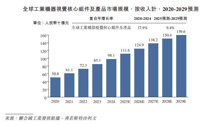 工业智能化转型为机器视觉与AMR行业带来广阔发展空间。根据弗若斯特沙利文预测,2025年至2029年,全球工业相机关联市场复合年增长率将达11.2%,中国市场达14.0%;全球制造业AMR市场复合年增长率为18.3%,中国市场为16.8%。