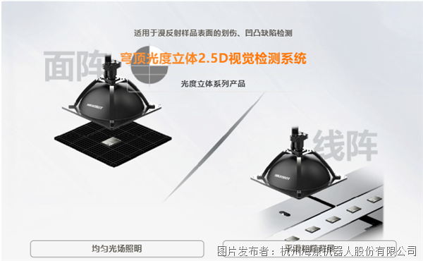 穹顶光度立体2.5D成像系统可搭配面阵或者线阵相机使用,对应工业场景中的静态与动态拍摄。穹顶2.5D的系统采样速度更快,可实现更优的产线节拍。